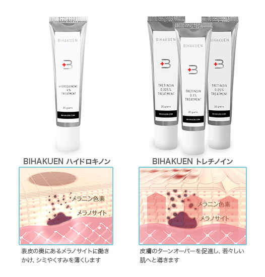 “美白の救世主&肌の漂白剤”ともいわれるハイドロキノン。“肌のターンオーバーを促進”するトレチノイン。『漂白』と『促進』の相乗効果で、あなたのお肌を生まれ変わらせます。