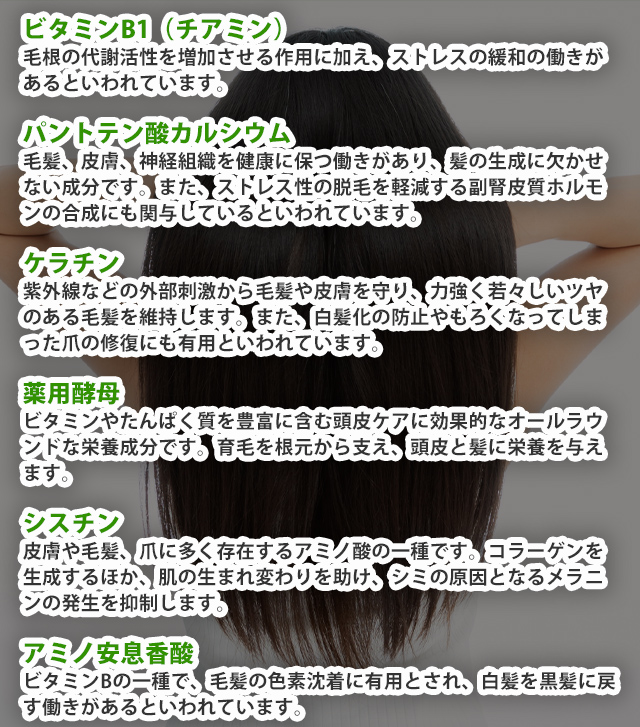 また白髪を防止し、もろくなった爪を修復する成分も含まれています。